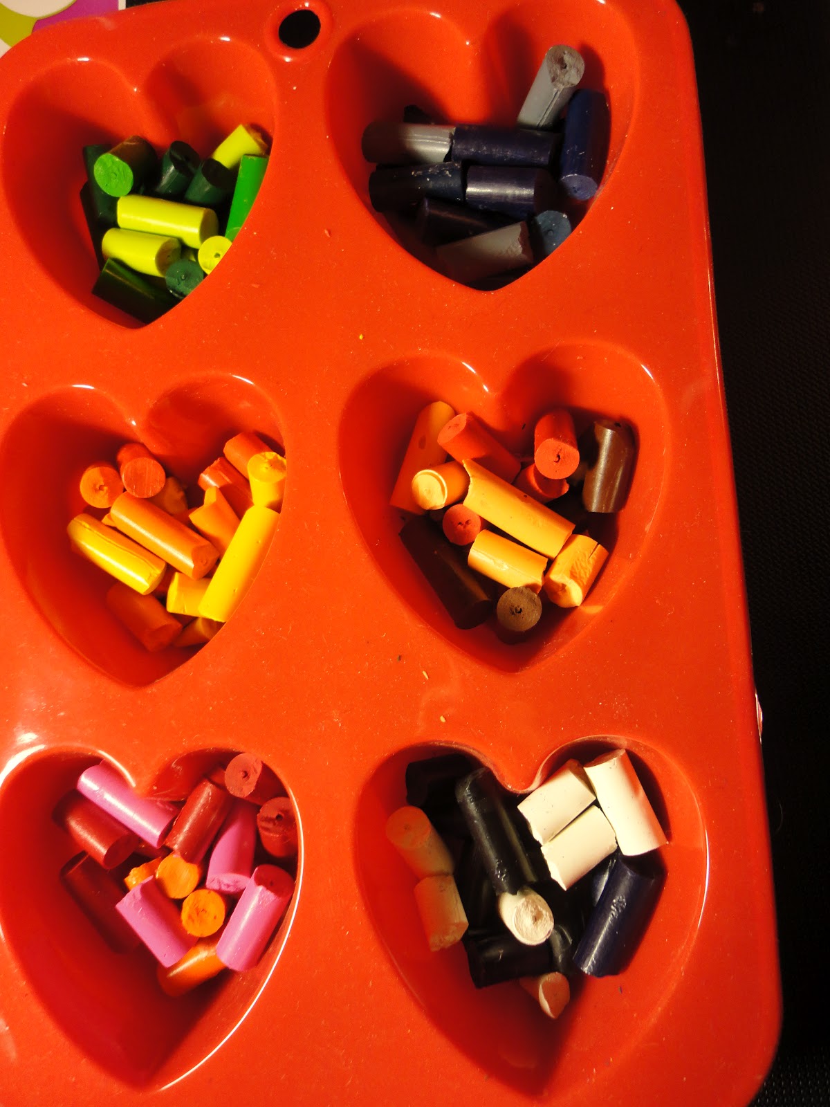 *It is highly recommended that you use a SILICONE mold, because then you can "fold" it and help the crayon out after it's cooled down. If you're using a baking pan, it definitely be more difficult.